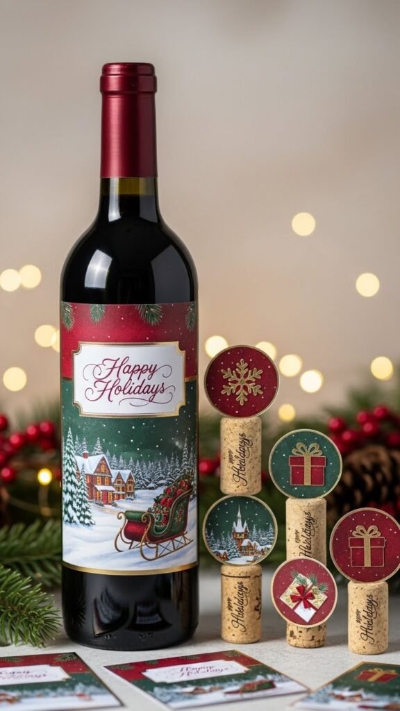 You’ll secure wine labels with double‑sided tape or glue dots, add matching cork toppers from card scraps, and personalize each bottle for a liberated, elegant gifting touch.