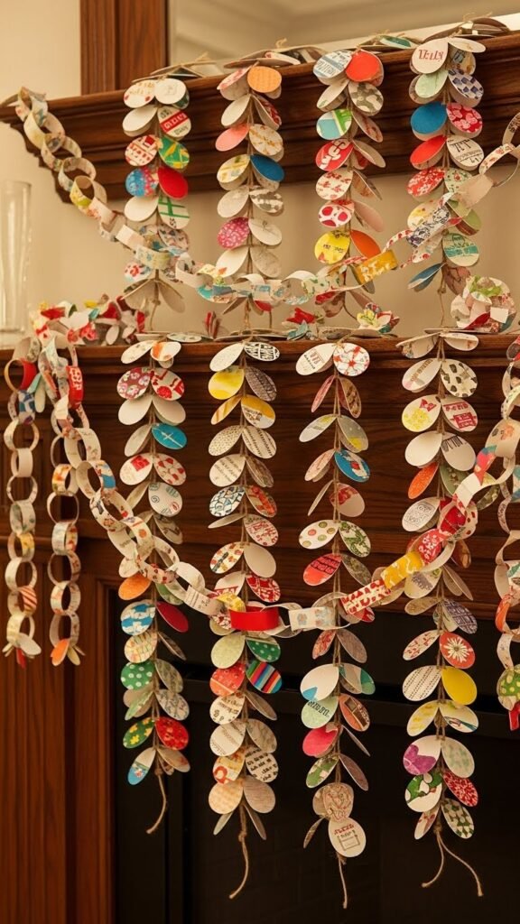 When you cut petal garlands from old card fronts, you’ll get a lightweight, high-impact mantelpiece that’s easy to swap out seasonally.