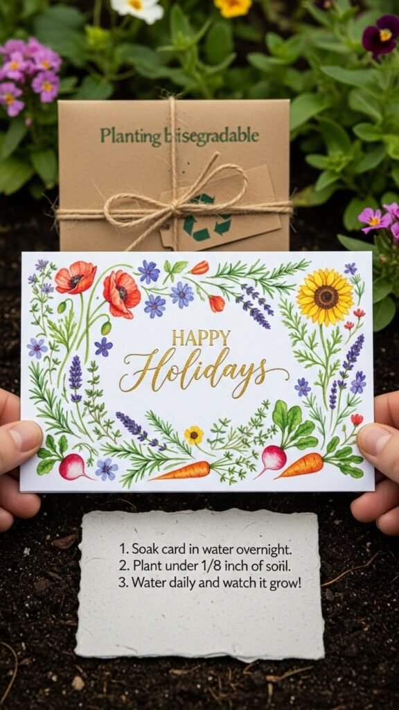 Give your recipients a greeting they can plant and grow: plantable seed paper holiday cards are made from biodegradable paper embedded with wildflower, herb, or vegetable seeds that sprout when you soak and bury the sheet. You’ll choose seed embedded designs, include clear planting instructions, note sprout count, and wrap in biodegradable wrapping so loved ones can freely plant, enjoy, and reuse the moment.