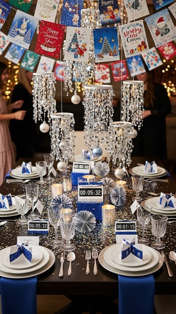 As you transform holiday cards into New Year’s Eve decorations, think beyond the mantel—cut, fold, and layer cards into banners, confetti, and table centerpieces that suit your party’s color palette and theme.