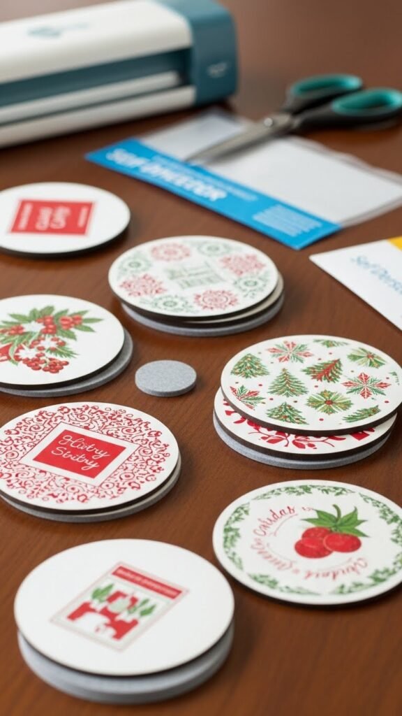 Give your table a personal touch by cutting favorite sections from old holiday cards and laminating them into durable coasters. You’ll trace uniform circles, trim edges cleanly, and use a home laminator or self-adhesive pouches for consistent results.