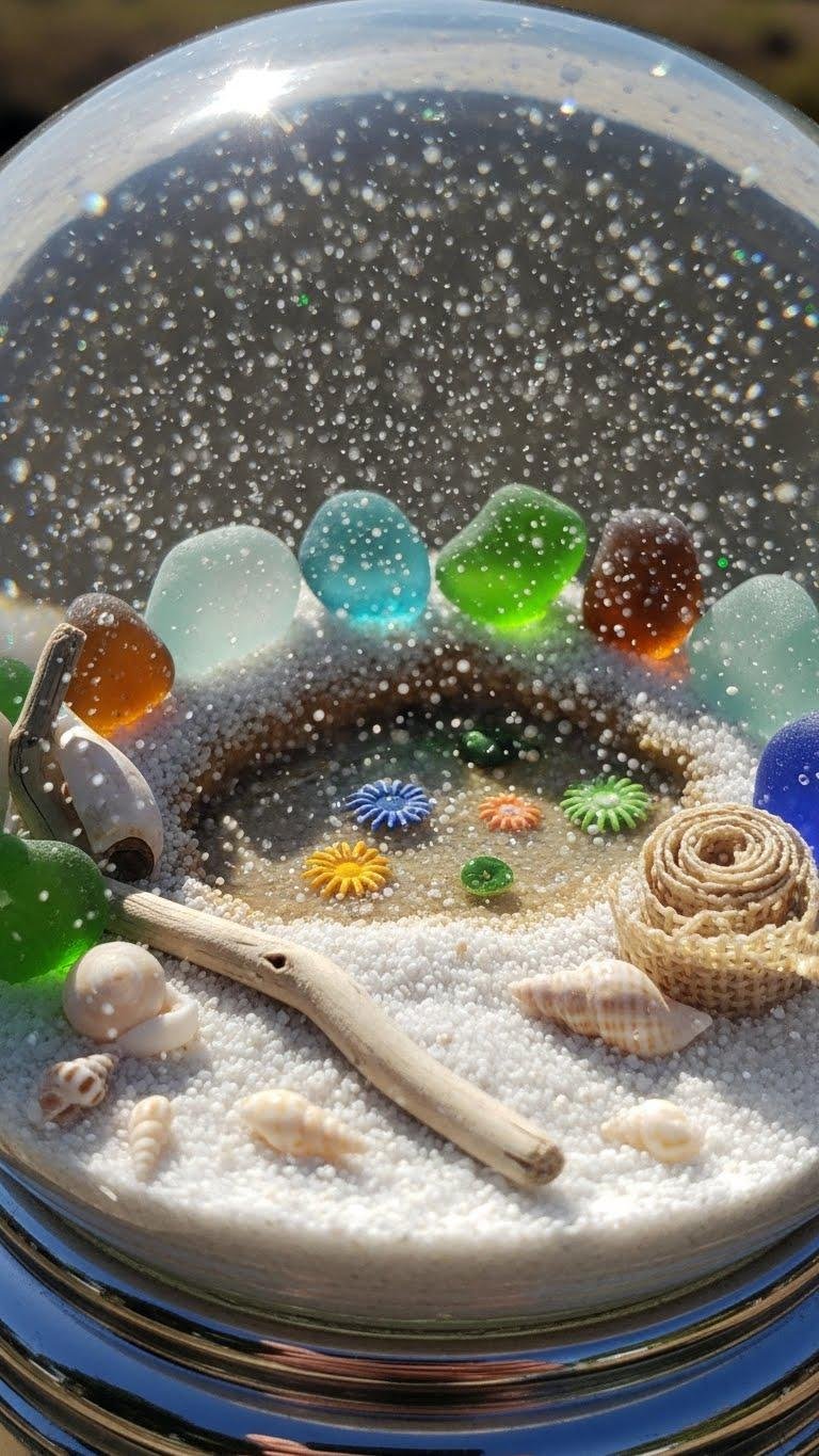 Bring a sun-soaked shore to your shelf by arranging bleached driftwood, tiny seashells, and a curled strip of burlap into a miniature coastal scene inside your globe. You’ll nestle sea glass like sunlit pebbles, glue a tiny tidepool vignette of sand and mini anemones, secure elements so they float gently when shaken, and let the scene breathe with open, free-spirited charm.