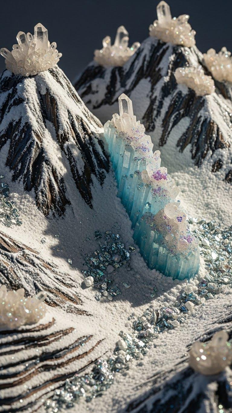 Imagine crafting a tiny alpine world where jagged peaks gleam with faux snow and clusters of quartz crowns the highest ridges; you’ll arrange mineral textures, layered foam or clay slopes, and mica flakes to catch the light like morning frost.