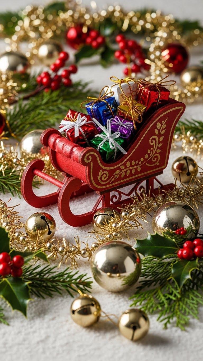 After you’ve laid out your retro garlands and baubles, slide a little red sleigh into the scene to anchor the eye and add movement. Position it slightly off-center, tuck tiny wrapped packages inside, and scatter miniature sleighbells around for sparkle.