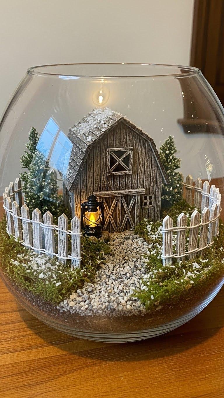 When you tuck a miniature rustic barn into a glass terrarium, it brings instant country charm—weathered wood, a frosted picket fence, and a dusting of faux snow that makes the whole scene feel freshly chilled; start by choosing a barn kit or carving a tiny structure from balsa, then plan where the fence will arc to lead the eye around mossy groundcover and a tiny path of crushed stone.