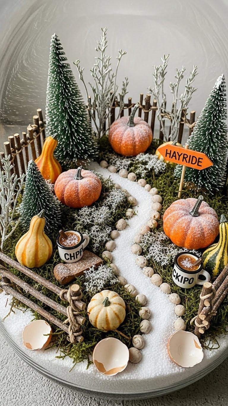 Then add a miniature hayride sign, tiny mugs suggesting spiced cider, and a winding path of crushed eggshell for contrast.