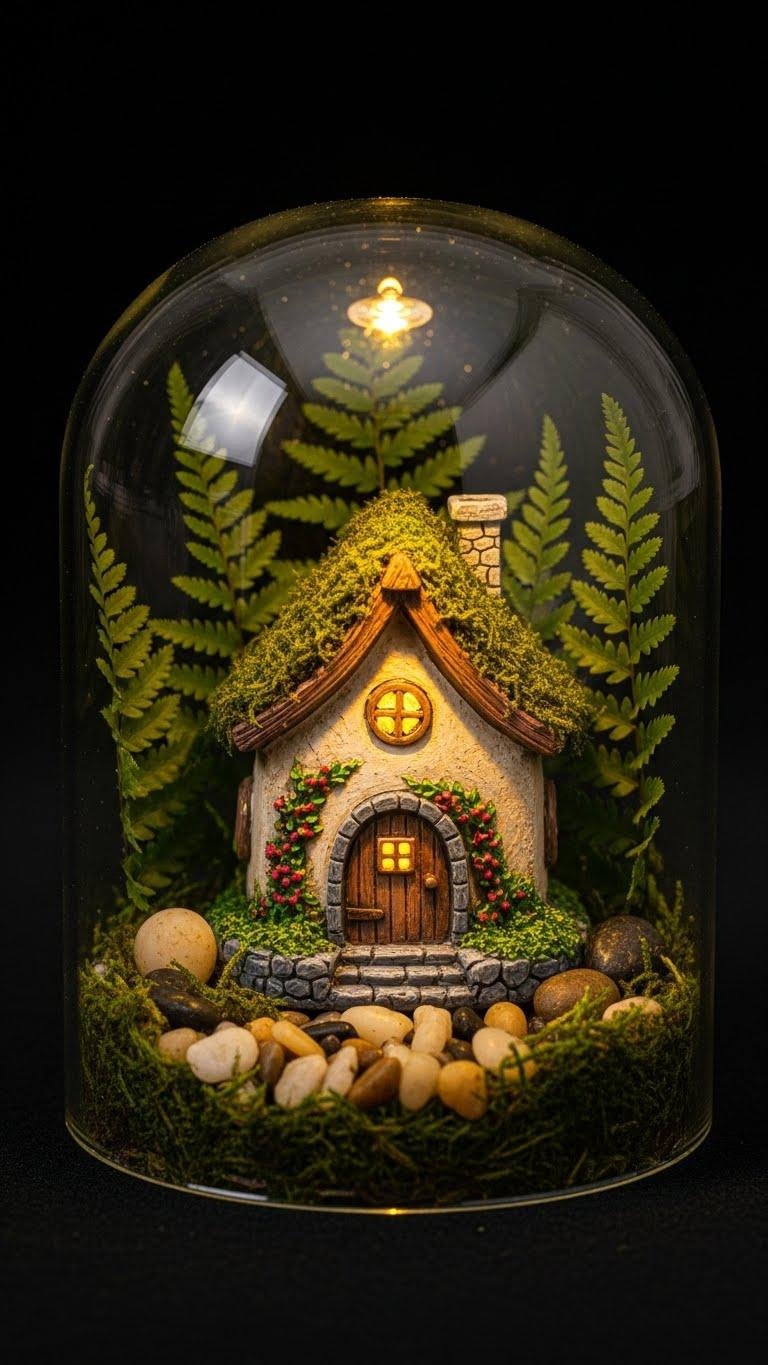 Place a micro LED for a warm lamp glow, arrange pebbles and ferns, then seal the dome for a portable escape.