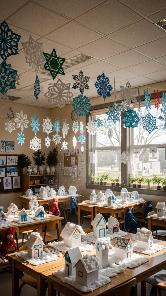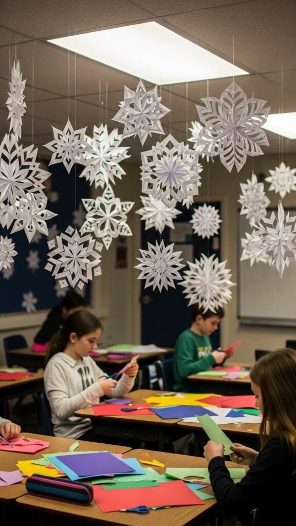 You’ll mix paper chains and tissue garlands, let students design varied flakes, and hang them high so the room feels open, joyful, and free.