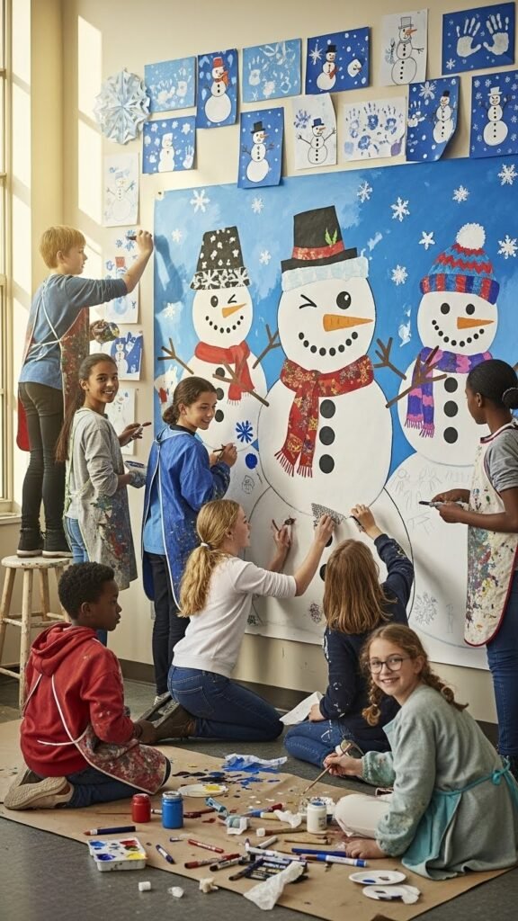 After celebrating the Winter Wonderland Showcase, keep the creative energy flowing by inviting students to work together on a Collaborative Giant Snowman Mural. You’ll guide community sketching, then encourage bold Layering techniques with paint, collage, and markers. Let students choose hats, scarves, and expressions freely, rotating roles so everyone contributes. It’s playful, inclusive, and transforms a wall into shared snowy art.