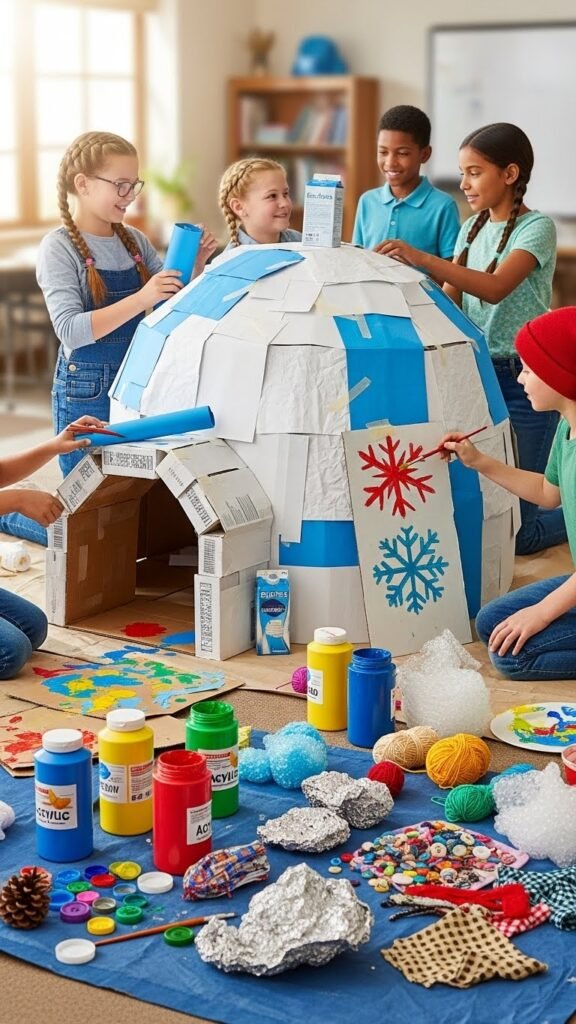 Gather your students and plunge into a Snowhouse Group Art Project that turns teamwork into a cozy, creative build—each group designs and decorates a life-size paper or cardboard snowhouse using paint, textured collage materials, and found objects for doors and windows.