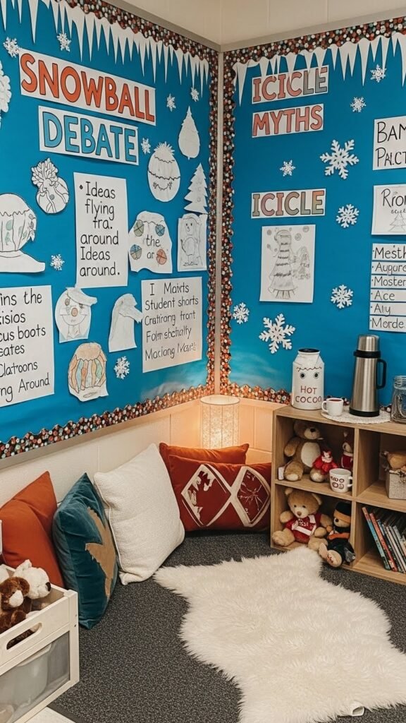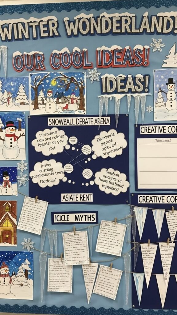 Bring the season to the front of the room with a winter-themed bulletin board that shows off student work and brightens everyone’s day. You’ll arrange bold titles, student art, and prompts for a Snowball debate where ideas fly. Add a corner for Icicle myths—short student-crafted legends—and leave space for free expression, choice, and rotating displays that celebrate creativity and classroom freedom.