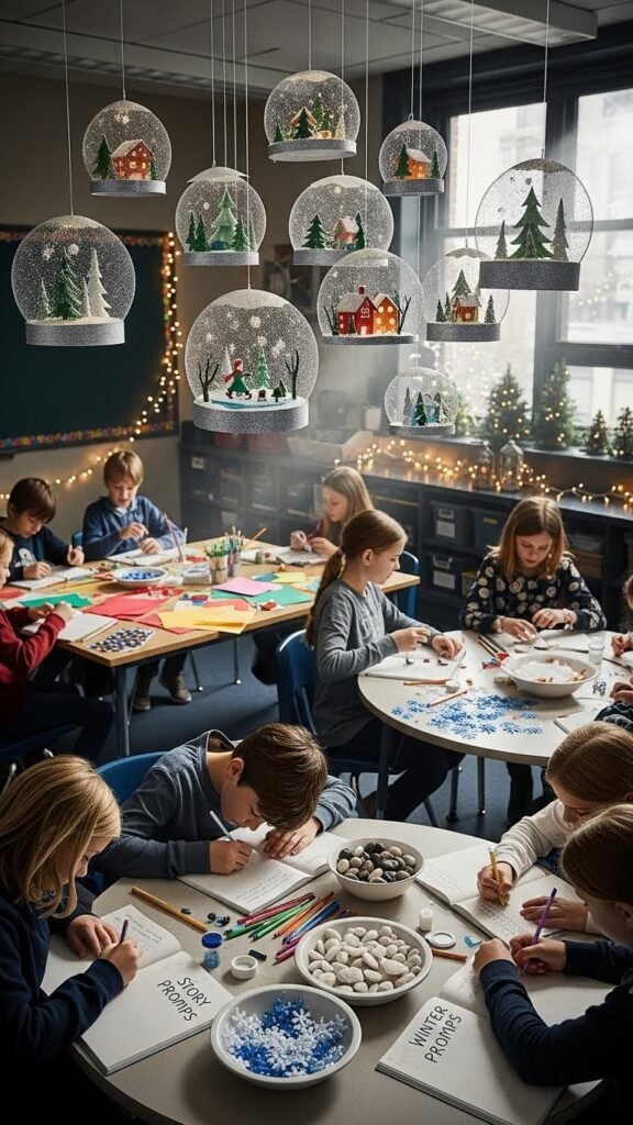You’ll craft lightweight snow globe ornaments, add tiny scenes, and invite students to write storytelling prompts tied to each globe. Suspend them above sensory stations for tactile play, then encourage notes in reflection journals.
