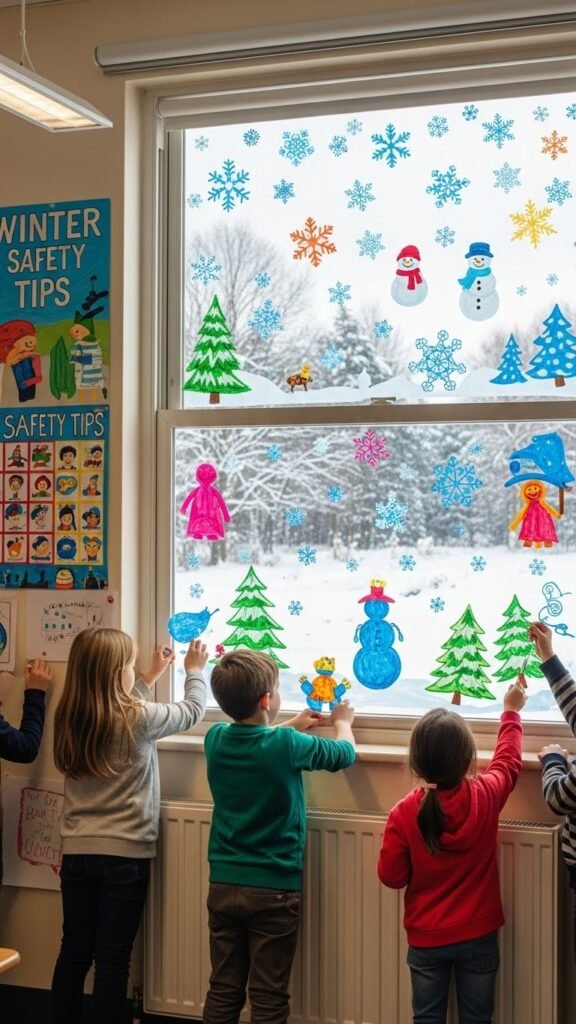If you want quick, eye-catching winter décor, frost window clings and painted window scenes give your classroom an instant snowy makeover.