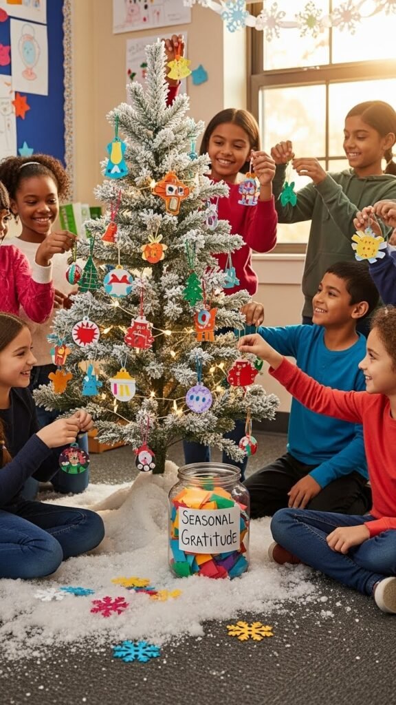 Add soft lights, faux snow, and a gratitude jar labeled Seasonal gratitude for students to drop thankful notes.