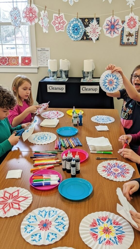 After the penguins and polar bears are up, set out a coffee filter snowflake station to keep kids crafting and learning about symmetry and pattern. You’ll provide scissors, markers, and dye; emphasize supply organization so students grab what they need.