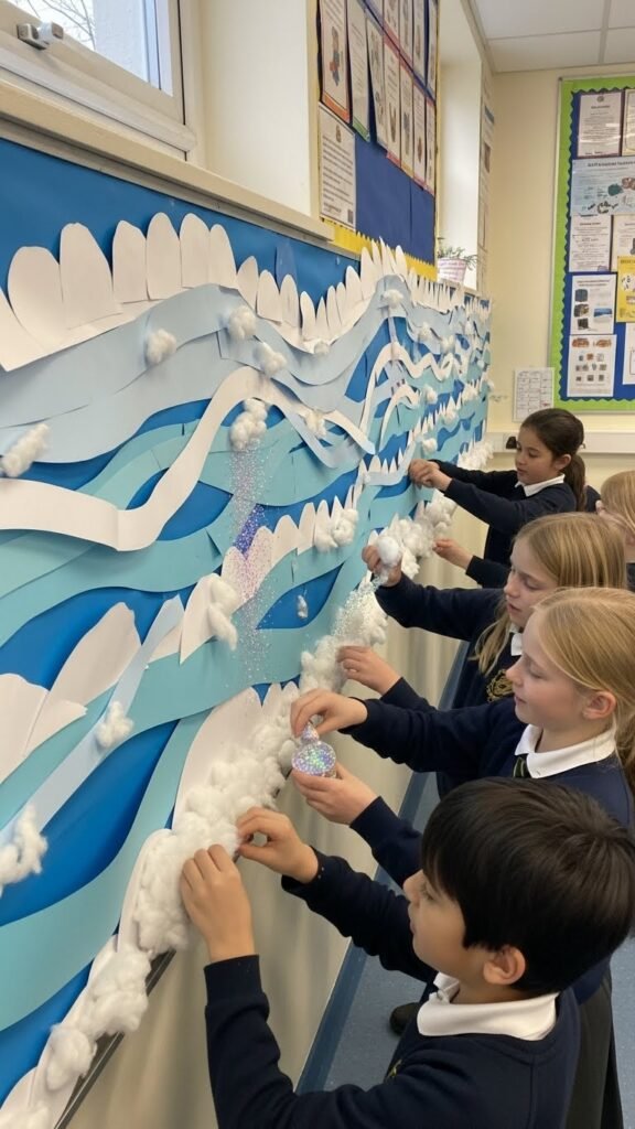 Layered paper snowbanks bring instant winter charm to your classroom walls and are easy to make with students’ help. You’ll cut curved strips, overlap paper layers, and vary heights to create playful wall texture.