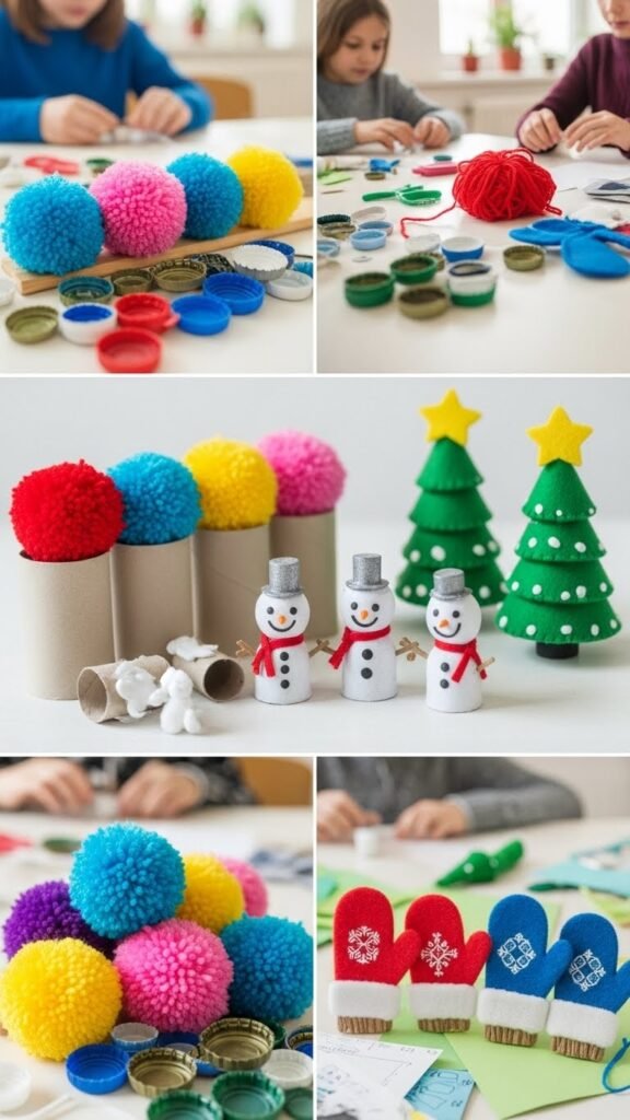 Grab clean recyclables like cardboard rolls, bottle caps, and scrap paper to make cheerful winter crafts that won’t cost a thing. You’ll weave recycled yarn into pom-poms, wrap rolls as mini snowmen, and glue upcycled felt for mittens and trees. Let students improvise, choose colors, and reclaim materials—this frees creativity, teaches reuse, and fills your classroom with playful, budget-friendly winter charm.