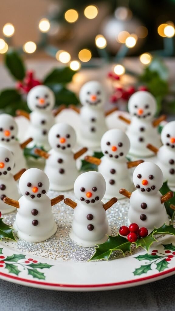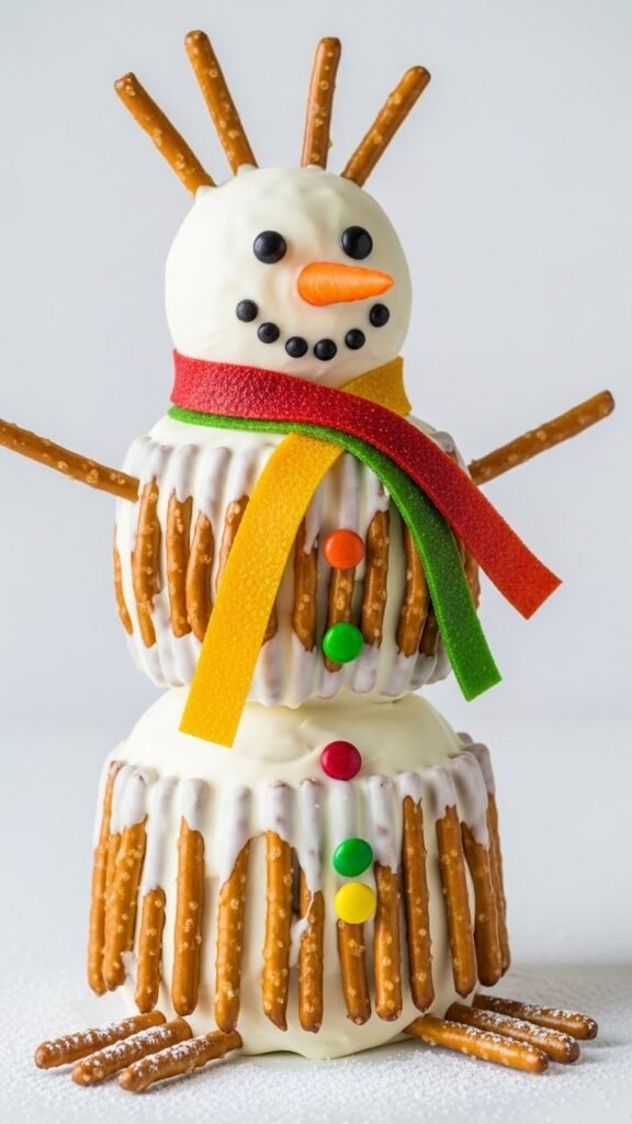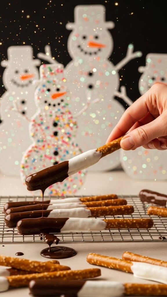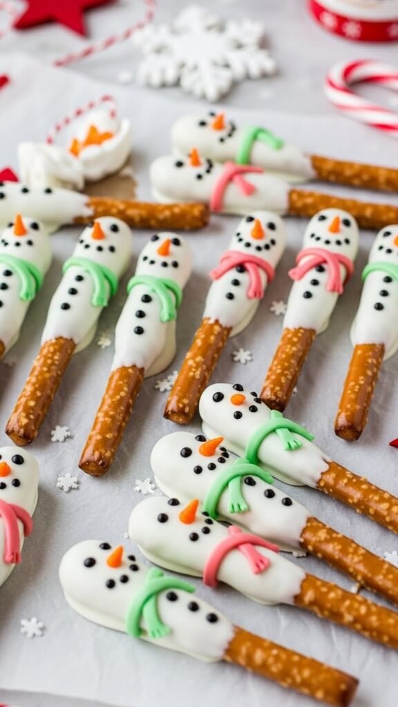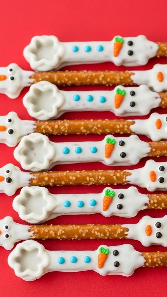 When you press tiny holiday cookie cutters into still-wet white chocolate, they turn ordinary pretzel rods into buttoned-up snowmen in minutes. You’ll press ½-inch shapes, remove gently, then add 3mm candy-dot eyes, a 2mm orange sprinkle carrot, and 4 tiny sugar-button snowman embellishments spaced 1cm apart.