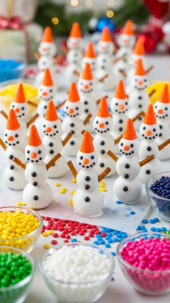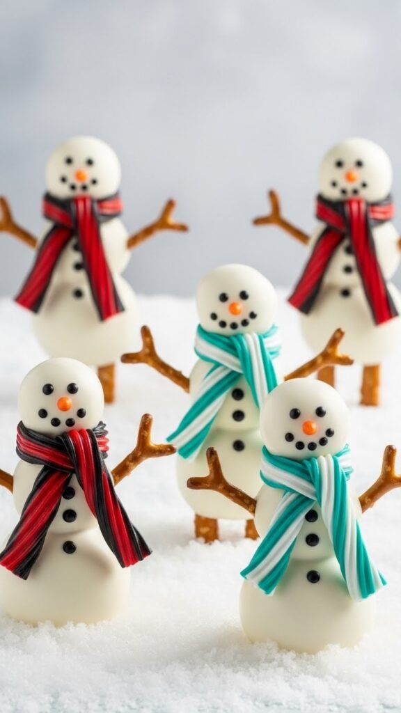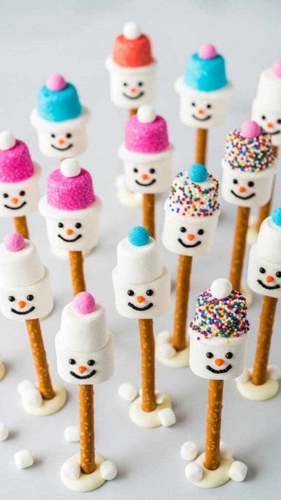 Bring to life tiny snowmen with a pop of color: dip 4–6-inch pretzel rods in 1/2 cup melted white candy melts to within 1 inch of the top, chill them on parchment until firm, then top each with a miniature orange candy cone (about 1/2 inch long) as a carrot nose.