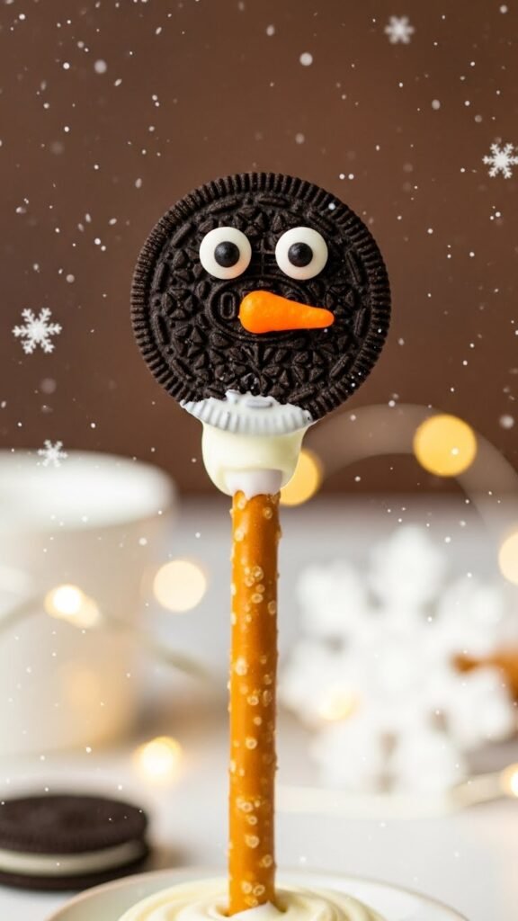 Grab a pretzel rod and press a cream-filled Oreo half onto the top so the cookie becomes a round snowman head perched above the salty stick, securing it with about 1 teaspoon of melted white chocolate applied where the pretzel meets the cream; hold for 10–15 seconds until set.