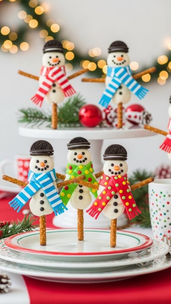 Often you’ll brighten your snowman treats by wrapping the pretzel rod body in a tiny candy-melt scarf: melt 1/2 cup colored candy melts (about 90–100 g) until smooth, dip a 6-inch pretzel rod halfway, then use a small offset spatula to drag a 1/2-inch-wide ribbon of contrasting color around the neck area; work quickly so the melts set with crisp edges, and let each scarf firm for 5–8 minutes on parchment before adding the Oreo head. You’ll create Candy melt scarves that pop with stripe or polka-dot accents, making Colorful snowmen perfect for liberated, playful holiday tables.