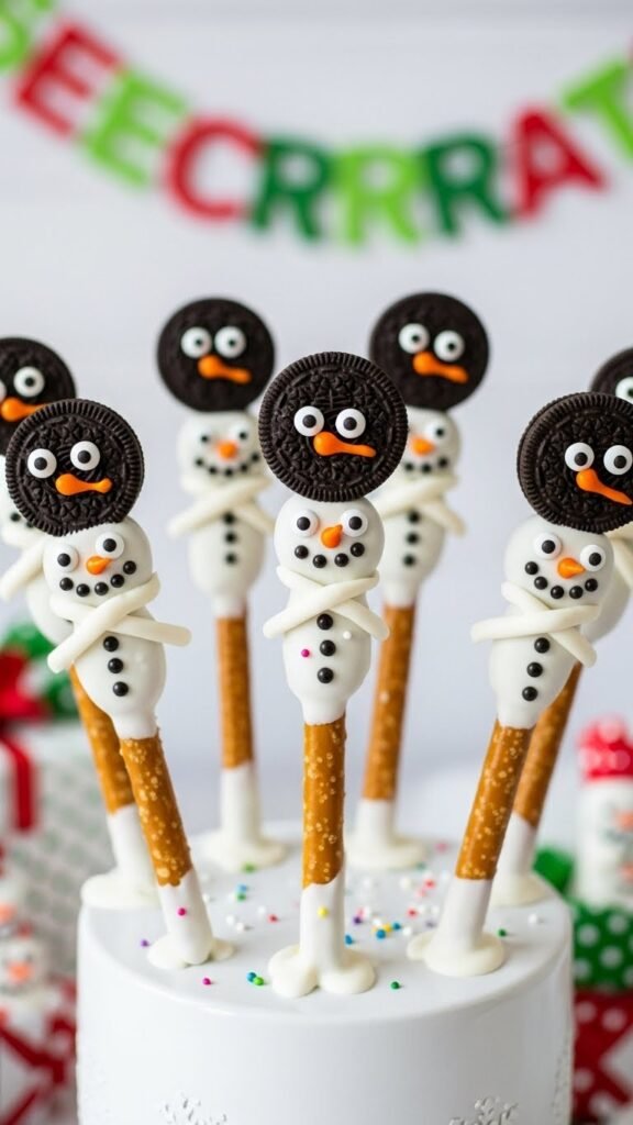 After stacking your Oreo snowman head, you’ll want to add a little sparkle by coating the pretzel body in snowflake sprinkles. Dip 6-inch rods in 3/4 cup white candy melt, tap excess, then roll in 2 tablespoons tiny snowflake sprinkles. You’ll create crisp winter textures and repeating snowflake patterns. Let set 10 minutes on parchment; enjoy playful, unfettered holiday treats.