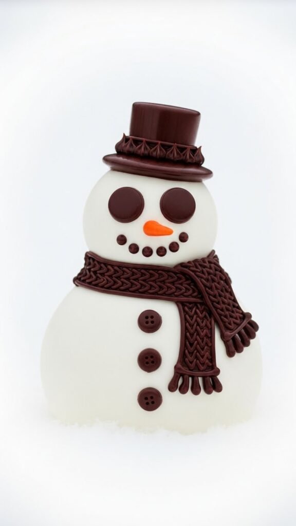 The dark chocolate brim contrasts with white coating, forming clean Snowman silhouettes against sprinkles or edible glitter.