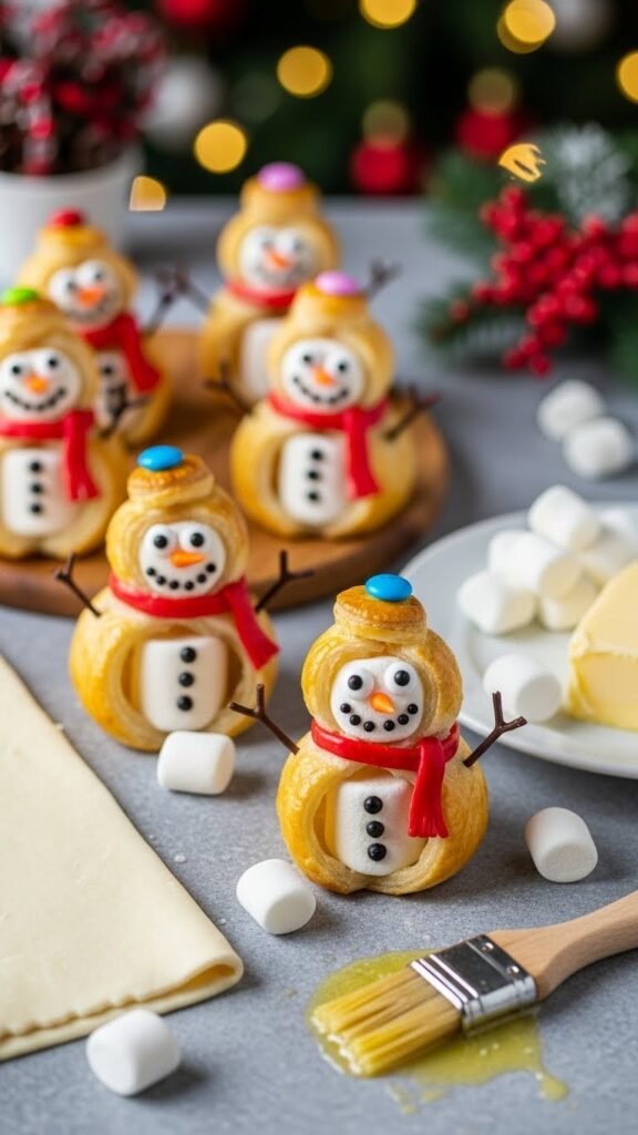 When you wrap pillowy marshmallows in buttery puff pastry and bake them until golden, they puff into charming snowmen that crackle with flaky layers and gooey centers; use 1 sheet of thawed puff pastry, 12 large marshmallows, and a scant 1 tbsp melted butter to brush before baking. You’ll craft Flaky snowmen in Marshmallow couture—trim, brush, bake 18–22 minutes at 400°F.
