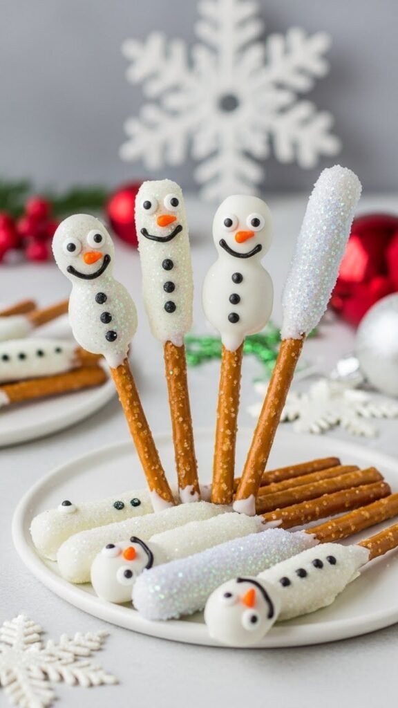 Often you’ll find these Glittered Sugar Snowman Pretzel Sticks steal the show at holiday parties: crisp pretzel rods get dipped in 6–8 oz melted white candy coating, rolled in 2–3 tbsp superfine sanding sugar and a pinch of iridescent glitter, then decorated with mini candy eyes and tiny carrot nose sprinkles to form cheerful snowmen.