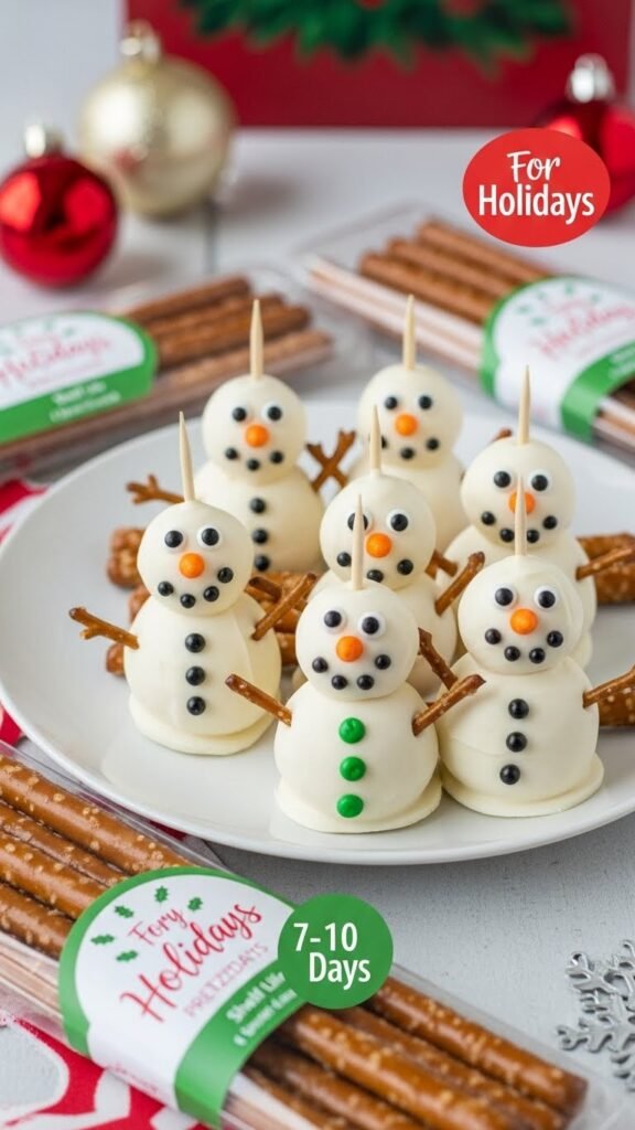 Spread a layer of glossy melted white chocolate evenly over 12 pretzel rods, leaving the top 1 1/2 inches uncovered for a scarf; chill them on parchment until the coating’s set. You’ll pipe 1/8-inch eyes and a 3/16-inch carrot nose, tie a 3/4-inch fondant scarf, and pack with festive Holiday packaging. Try cocoa or peppermint Flavor variations for bold twists.