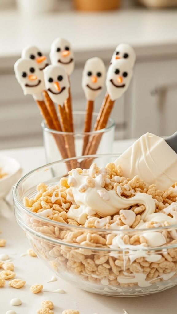 You’ll press the crispy cereal mixture onto chilled pretzel rods, achieving marshmallow crunch texture and snowy peaks. Let set 15 minutes.