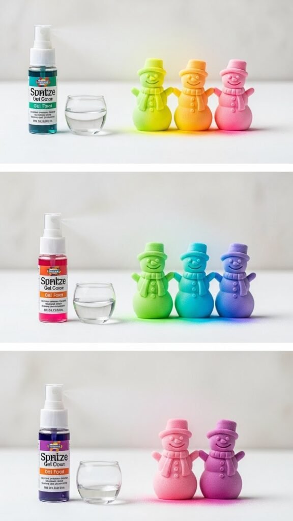 Usually you’ll get the cleanest ombre by working from lightest to darkest: mix 1 teaspoon of concentrated gel food color with 3 tablespoons of clear alcohol (vodka) or lemon extract in a small spray bottle, then add 1–2 tablespoons of water if needed to thin for a fine mist.