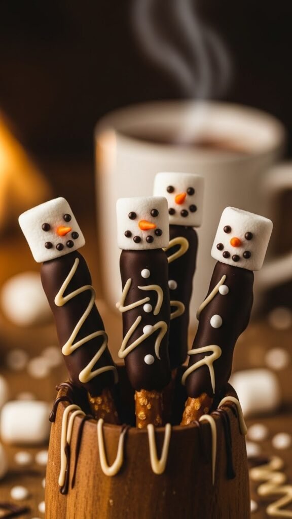 Nestled like tiny guests at a winter tea, these hot cocoa-themed snowman pretzels turn salty crunch into cozy sips: dip 200 g pretzel rods two-thirds into melted vegan dark chocolate (about 180 g), let them set 10 minutes, then drizzle a 50 g warm milk-chocolate-style vegan coating in zigzags to mimic hot cocoa foam.