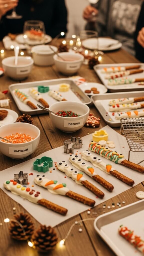 For a festive party project that’s quick to set up and impossible not to smile at, gather pretzel rods, white chocolate, tiny holiday cookie cutters (½‑inch), 3mm candy‑dot eyes, 2mm orange sprinkle carrots, and sets of four 4‑mm sugar buttons per rod; you’ll arrange stations so guests can dip, press shapes into wet chocolate, remove cutters, then place eyes, carrot noses, and four buttons spaced 1 cm apart to create crisp, buttoned‑up snowmen in minutes. Set clear assembly tips: label bowls, provide parchment, use shallow trays, and keep a drying rack — your party kit makes decorating fast, communal, and utterly joyful.