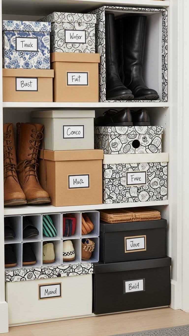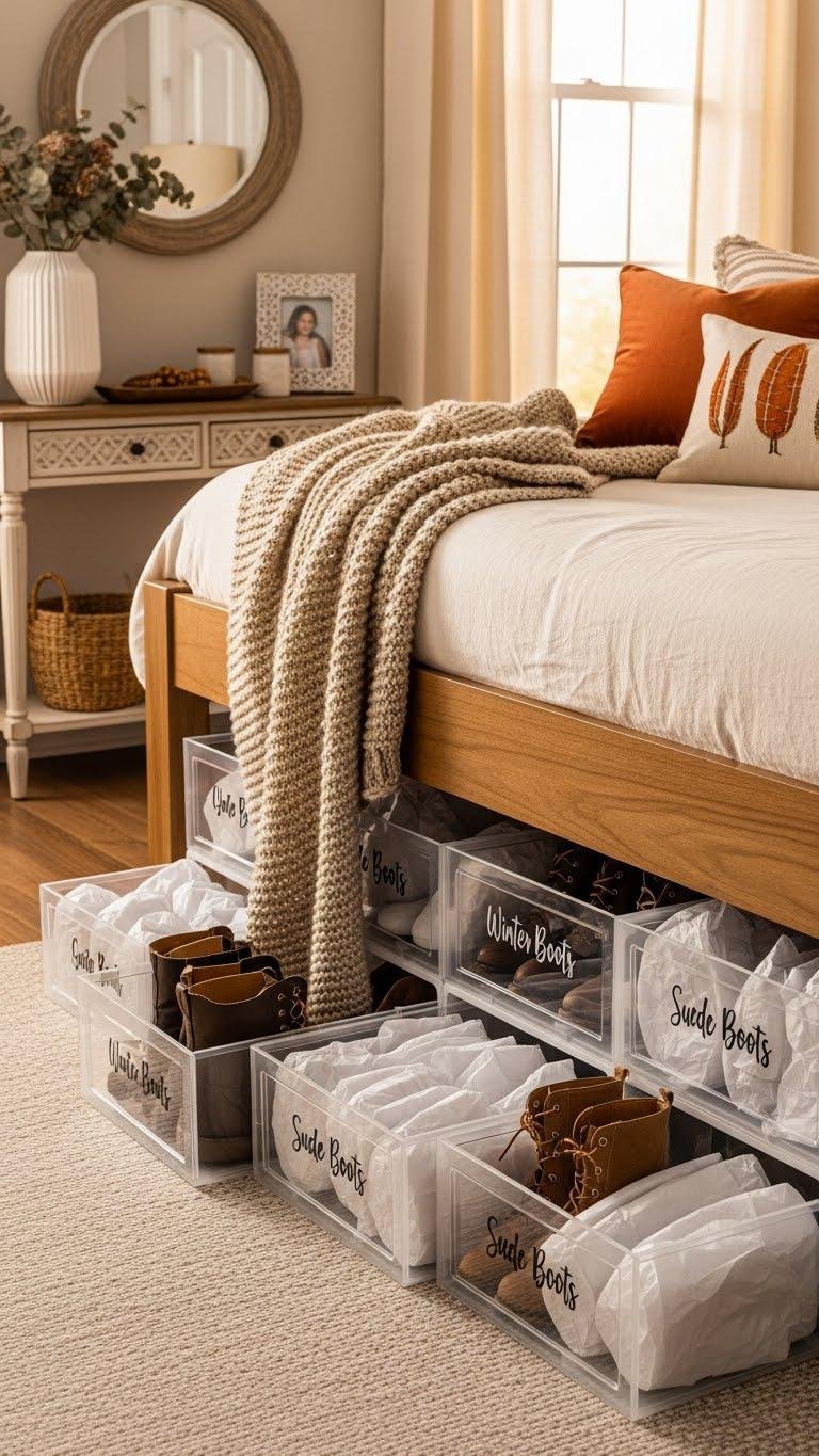 You’ll slide boxes under the bed for easy access, label each for quick boot rotation, and protect leather or suede with tissue.