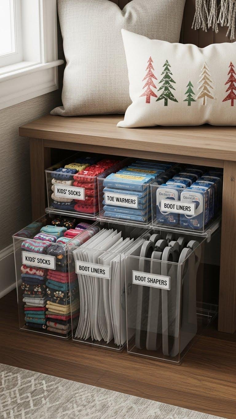 Tuck compact winter items into flip drawer organizers to keep small collections—like kids’ extra socks, toe warmers, liners, and boot shapers—neat and easy to find. You’ll label sections, use drawer dividers for tidy separation, and choose stackable trays to save floor space.