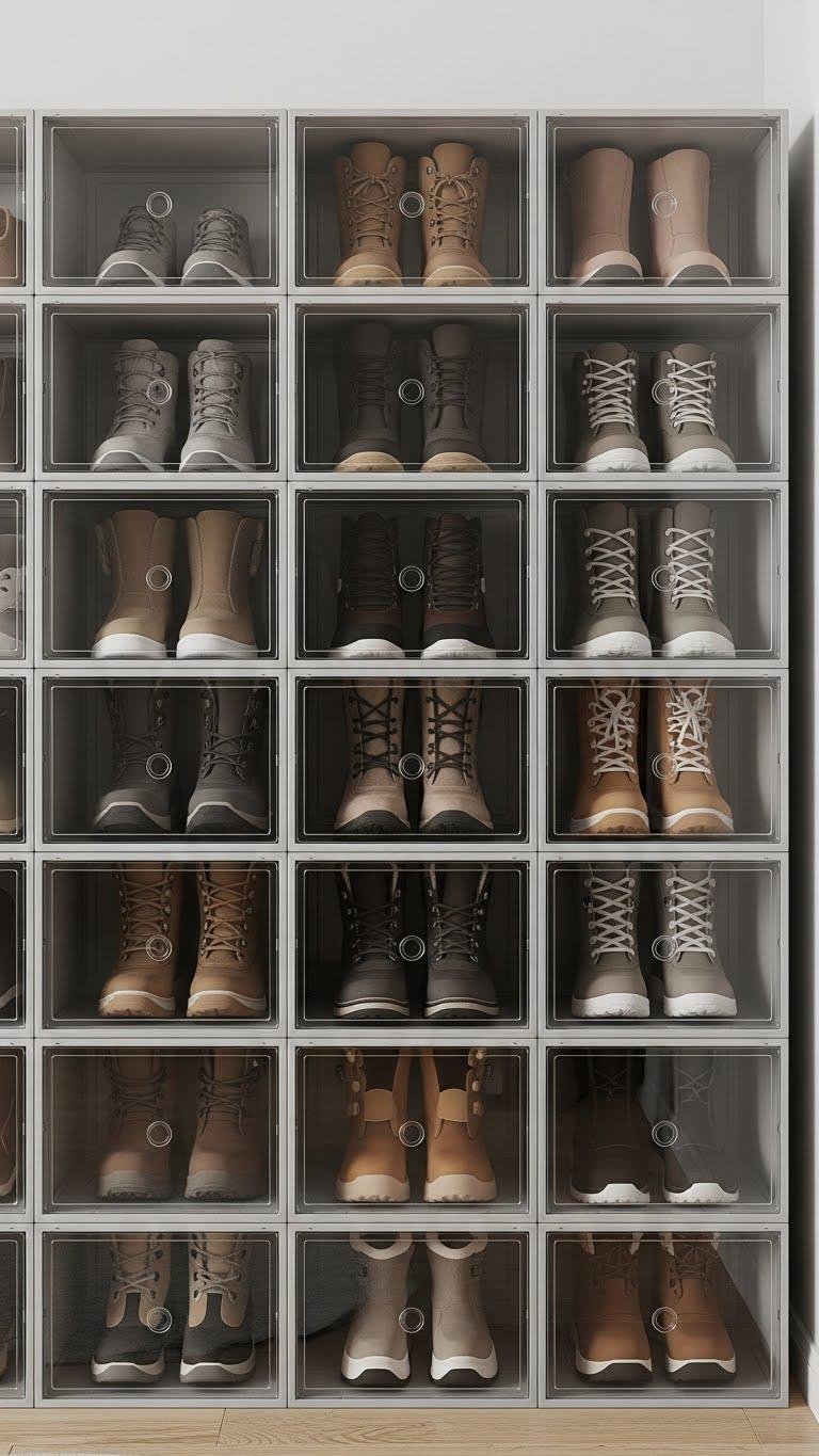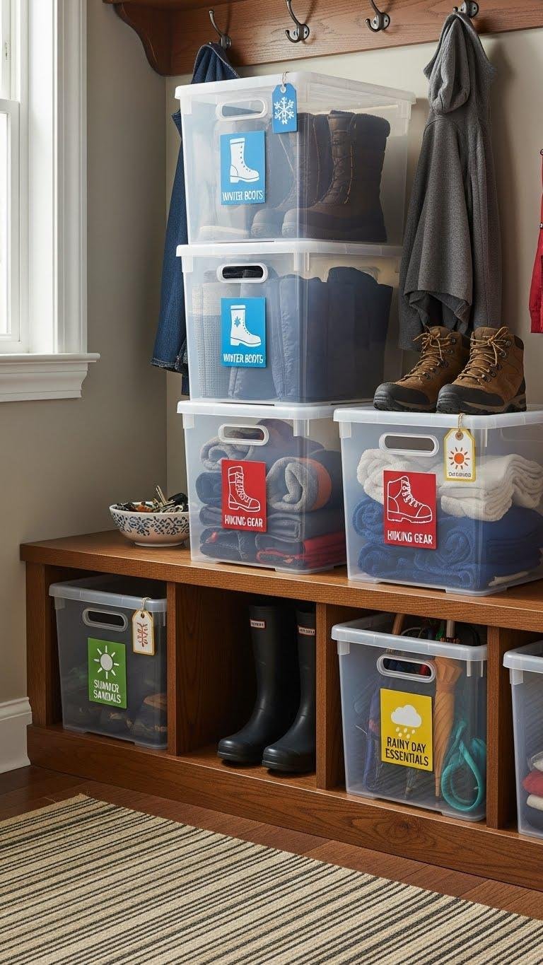 Label each breathable container for quick access, slide them under benches or stack to ceiling height, and grab pairs without fumbling. This keeps your entryway tidy, functional, and free for movement.