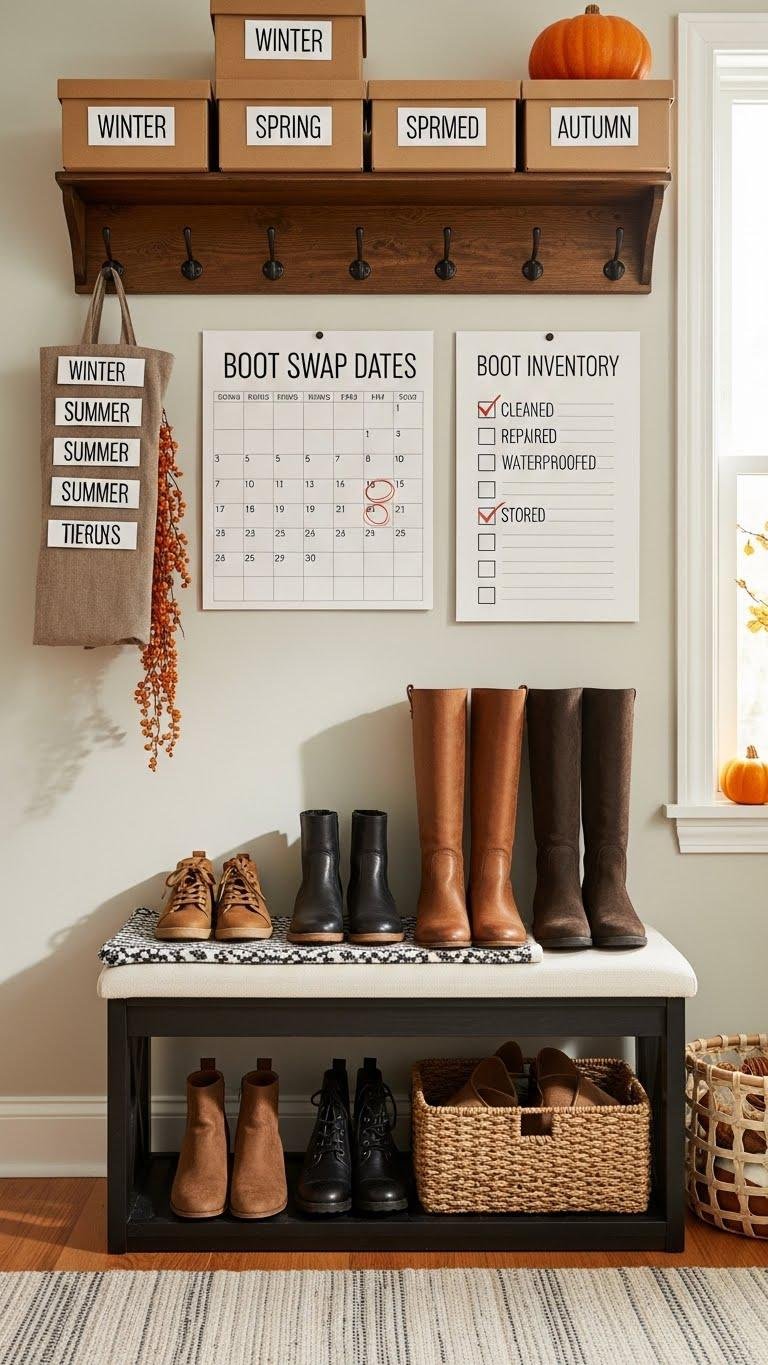 Regularly rotate your boots each season to keep entries uncluttered and extend footwear life: choose a fixed swap date (like the first day of each season), store off-season pairs in labeled boxes or breathable bins, and place the current season’s boots front-and-center on a bench or mat for easy access.