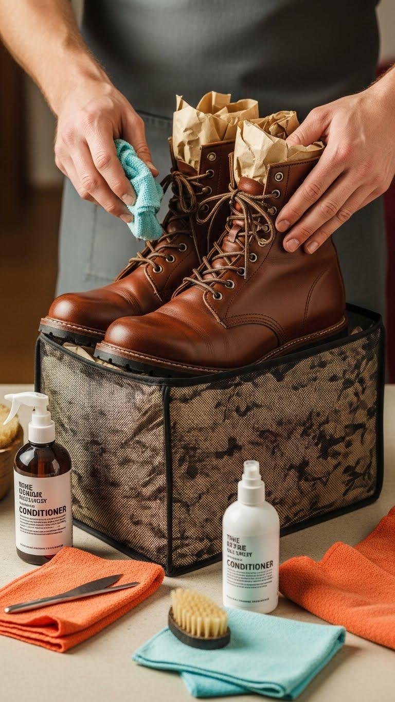 You’ll clean boots, apply leather conditioning evenly, let them dry away from heat, then stuff with paper to hold shape.