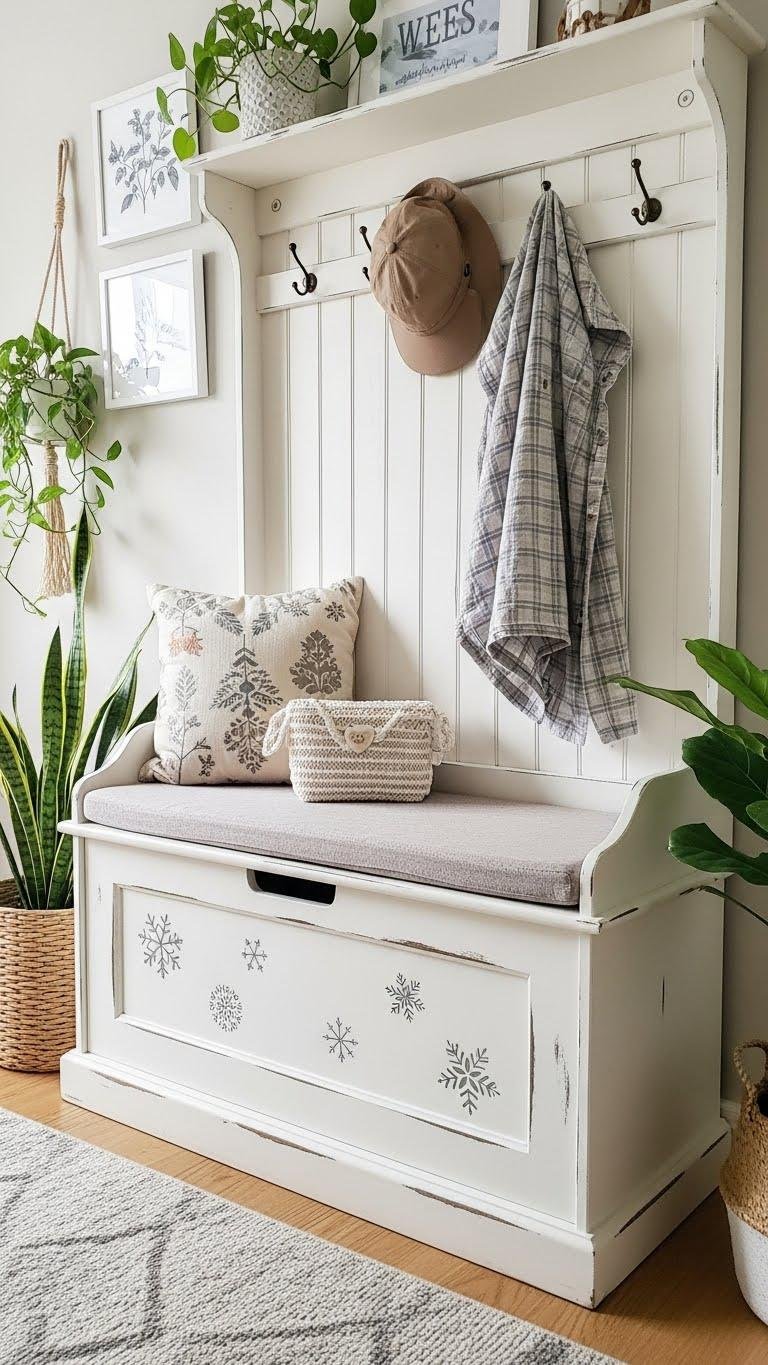 Give your plain storage bench a quick makeover to tie it into your entryway’s style and make it look intentional.