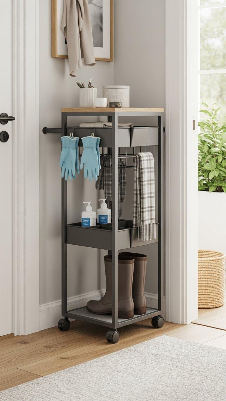 Roll a slim rolling cart into your entryway to create flexible, vertical storage that moves where you need it most.