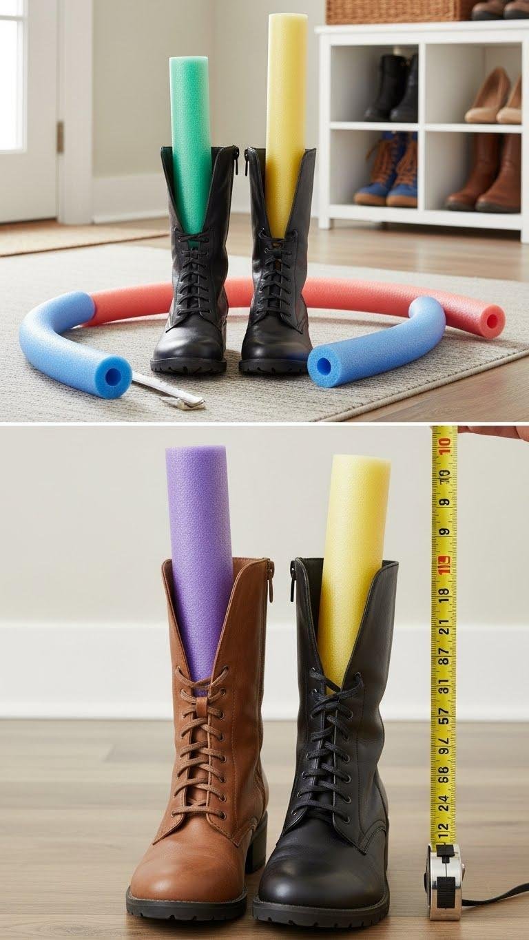 Give your boots a simple, inexpensive support by cutting pool noodles into boot shapers you can slide inside to keep shafts upright. Measure length, slice a foam cylinder to fit, and add a vertical slit for easy insertion. Follow a quick insertion guide: compress, slip into the boot, release. You’ll free floor space, prevent creases, and keep entryways tidy and flexible.