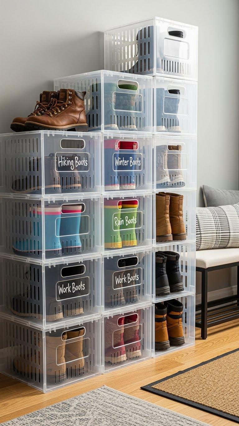 Stacking breathable plastic bins saves space while keeping boots aired out and ready to wear. You can use ventilated stacking bins with punched holes to prevent odors and moisture.
