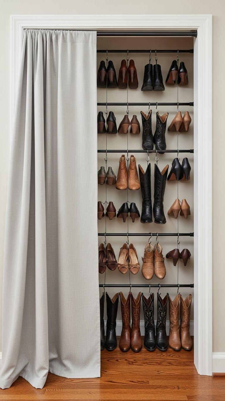 You’ll mount rods at staggered heights, slip boot hanging hooks over the bar, and hang pairs by heels to free the floor.