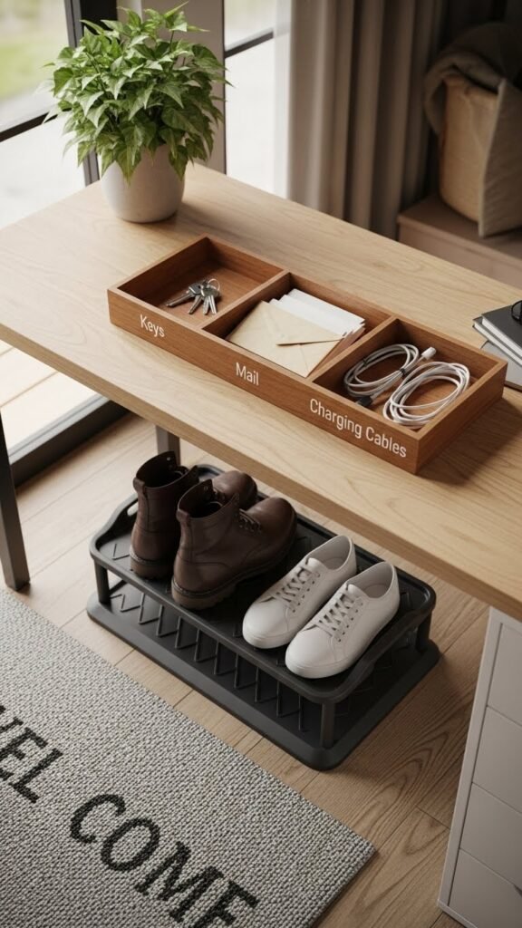 Place a slim welcome mat or fabric pad to catch winter grit and a compact shoe tray for damp footwear.