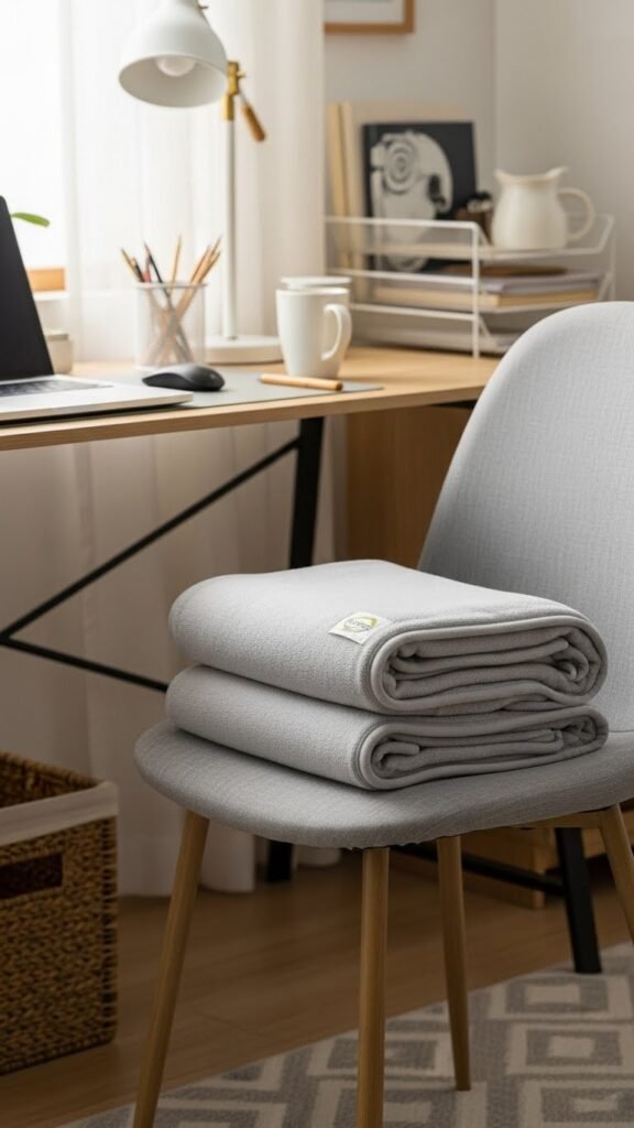 Often you’ll reach for a micro blanket or lap throw without thinking, so keep one folded or rolled within arm’s reach to warm your legs and shoulders during long work stretches.
