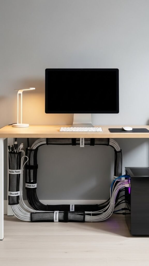 Route power and data lines under the desk, secure bundles with Velcro straps, and conceal runs with mesh sleeves.