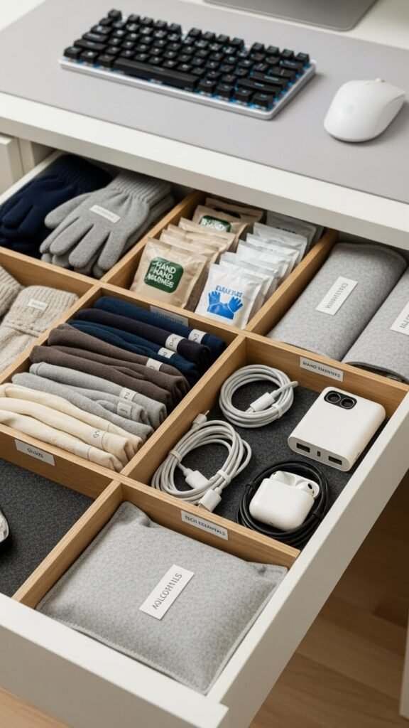 Use fabric pouches and felt inserts to separate gloves, hand warmers, and small tech. Label sections, keep frequently used items frontmost, and rotate contents as temperatures change.