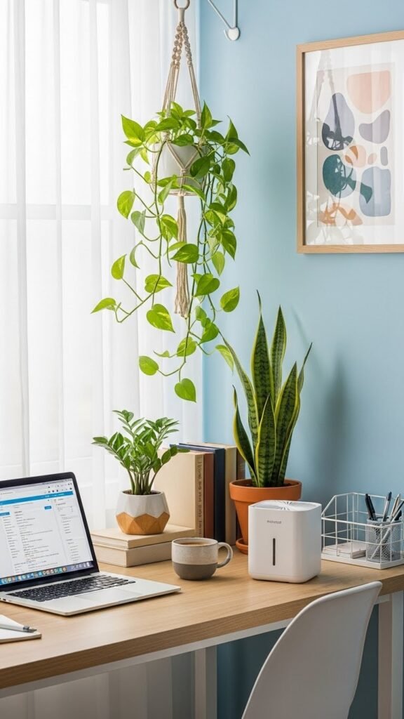Pick low-maintenance plants, set a simple plant care schedule, and position greenery to lift mood without crowding work surfaces. You’ll breathe easier and stay focused.