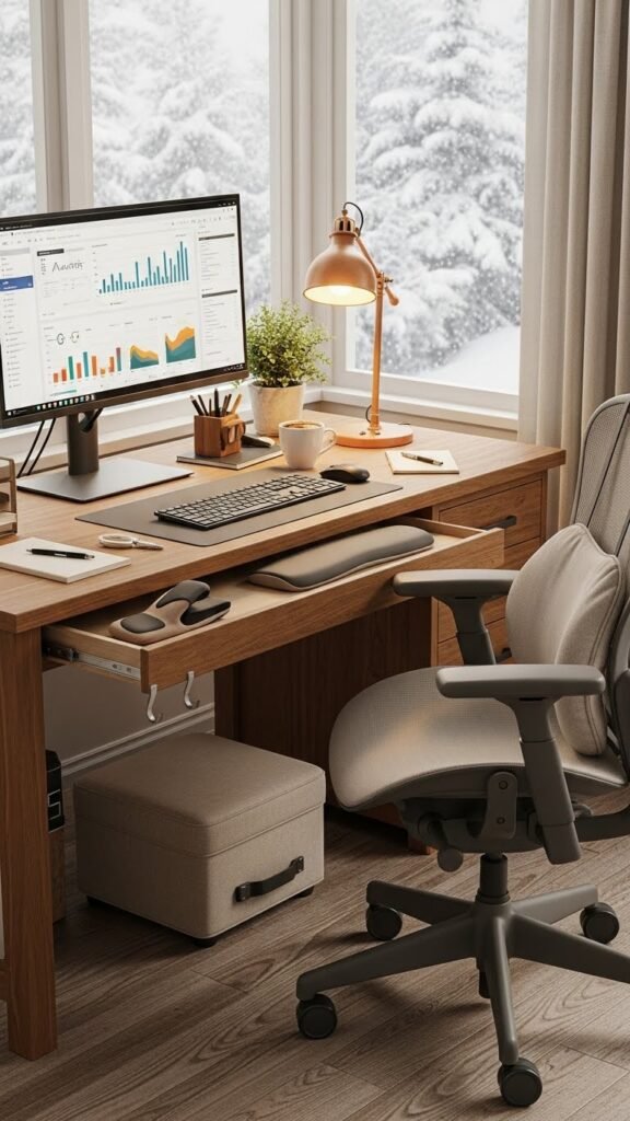 If you want to avoid strain and stay productive through long winter workdays, place ergonomic supports—like a lumbar cushion, wrist rest, and footstool—within arm’s reach so you can grab them without breaking your workflow.